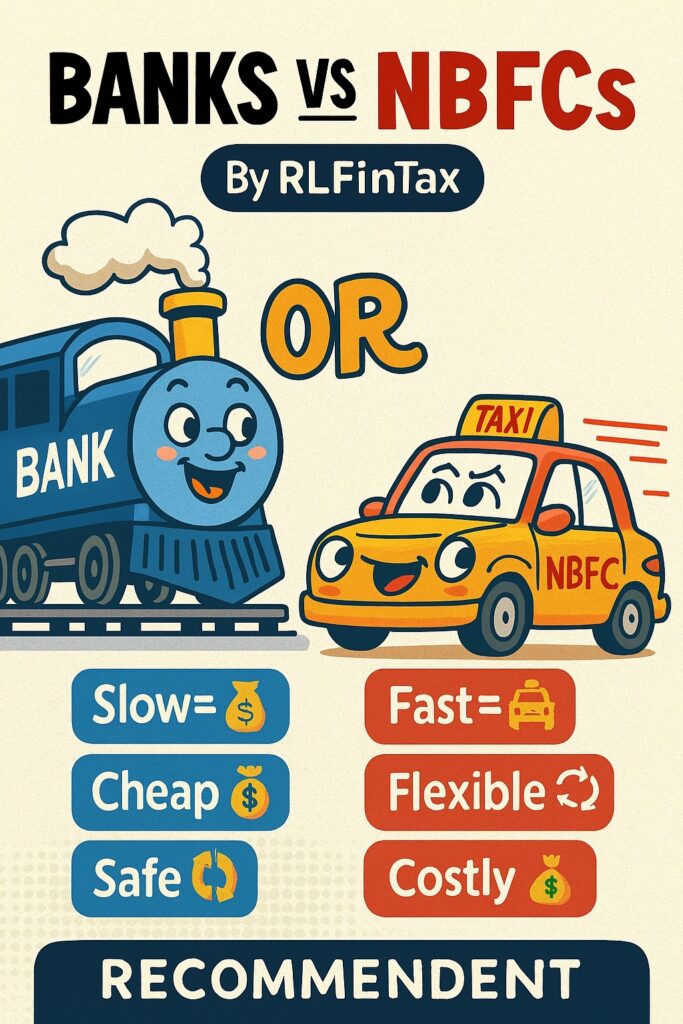 Home Services Detail Banks vs NBFC’s rishabg694@gmail.com December 2, 2025 Banks vs NBFCs: Who’s Your Loan Bestie? By RLFinTax.com – Finance Made Fun 🎭 The Showdown: Banks vs NBFCs Category Banks (The Slow but Steady Tortoise) NBFCs (The Fast but Pricey Hare) Interest Rates Lower, repo-linked. Home loans ~7–9%, business loans ~9–15%. Higher. Personal loans […]